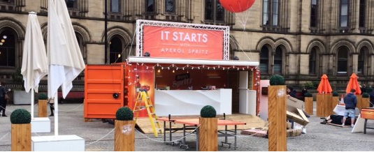 En este caso transformaron un viejo contenedor de mercancías en una llamativa barra móvil Aperol Spritz, con detalles muy trabajados para captar la atención, como un globo gigante, maceteros pintados a mano, estantes flotantes, asientos, parasoles ... Todo con la imagen de marca Aperol Spritz. La barra se fue de gira por todo el país, apareciendo en lugares como London Canary Wharf, Brighton, Bristol y Manchester. El evento alentaba al público a unirse a la diversión después de un largo día de trabajo.